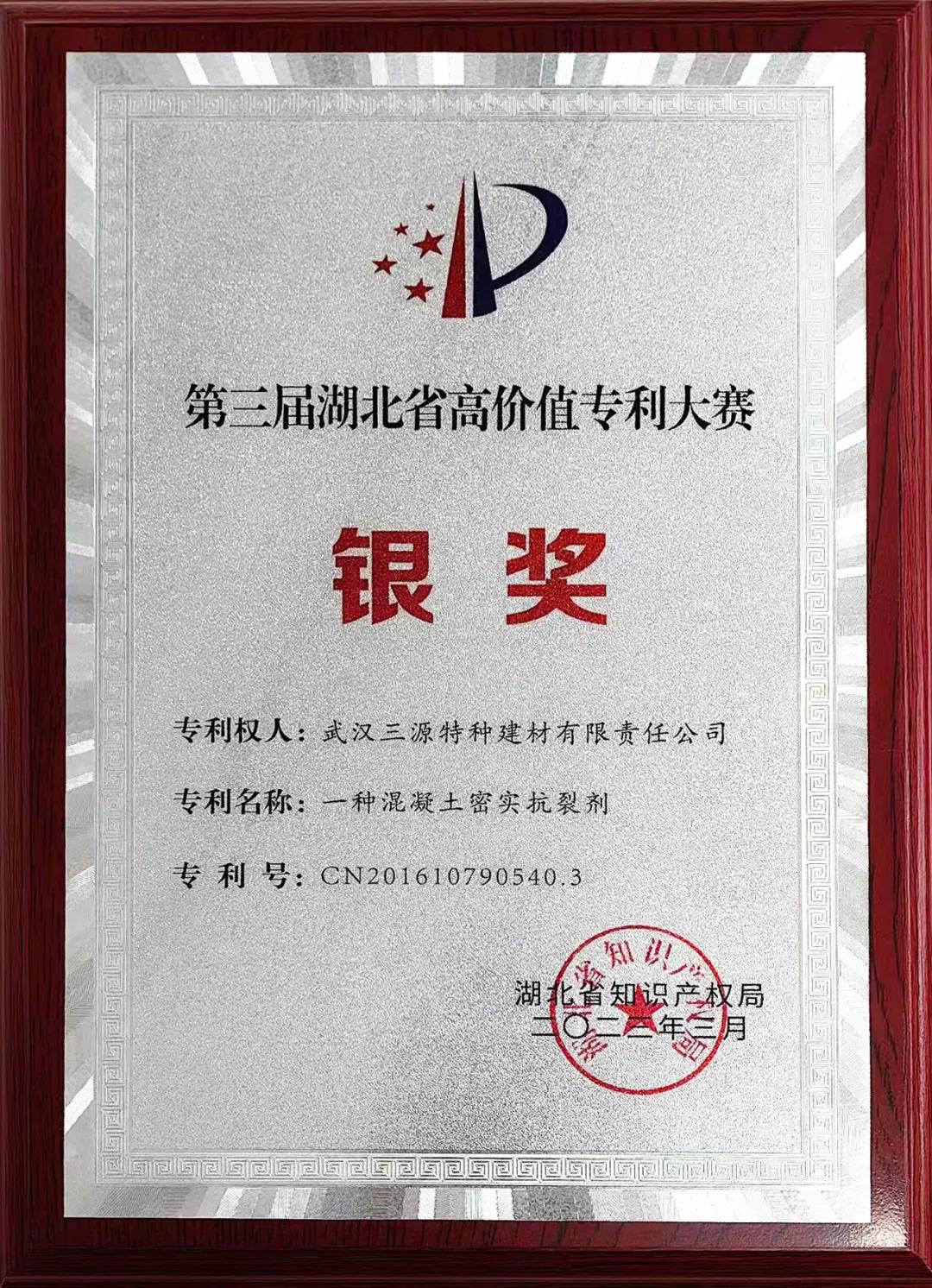3月3日,第三屆湖北省高價值專利大賽頒獎暨獲獎專利轉化對接活動在武漢成功舉辦。本次大賽由湖北省知識產權局主辦,頒發了金獎、銀獎、優秀獎共99個。武漢三源特種建材有限公司憑借發明專利“一種混凝土密實抗裂劑”榮膺湖北省高價值專利大賽銀獎。